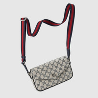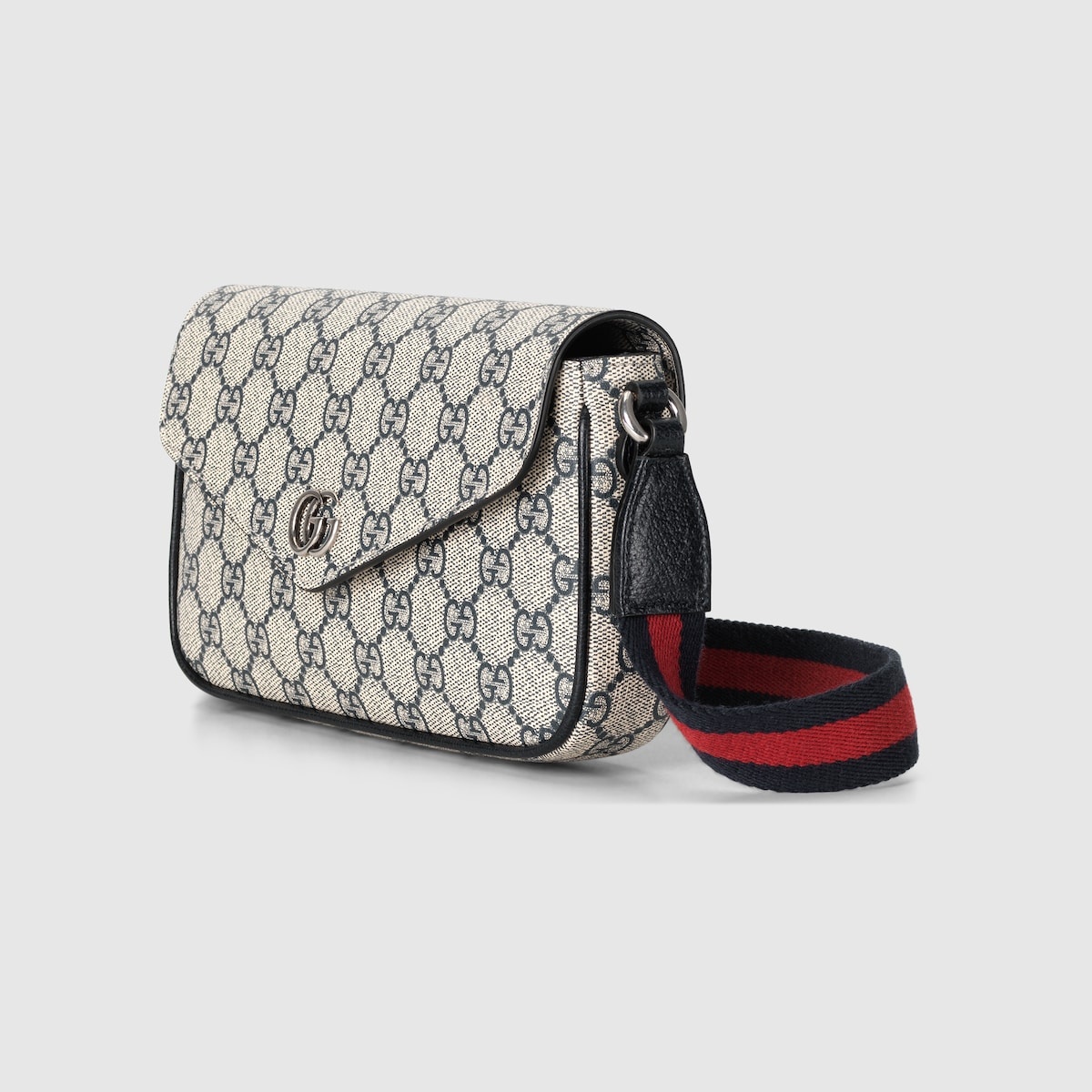 The world of Ophidia continues to evolve, incorporating new shapes and materials each season. Crafted from beige and blue Supreme canvas, this mini bag is further enriched by the Double G hardware and a Web shoulder strap. - Beige and blue GG Supreme canvas - Blue leather trim - Palladium-toned hardware - Cotton linen lining - Double G - Inside: 1 open pocket - Adjustable Web shoulder strap with 21.6" drop - Snap button closure - 8.7"W x 5.1"H x 1.6"D - Made in Italy - Fits up to iPhone Pro Max/Plus, Airpods, small wallet, and lipstick