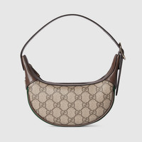 The Ophidia collection evokes the House’s heritage with the signature Web stripe and Double G emblem in light gold-toned finish. The styles are crafted from soft GG Monogram coated fabric, featuring green cotton lining inside. The crescent shape of this small shoulder bag features the emblematic Web trim. - Beige and dark brown GG Monogram coated fabric - Brown leather trim - Light gold-toned hardware - Green cotton linen lining - Double G - Web - Inside: 2 card slots - 5.9" handle drop - Zip closure - 7.9"W x 5.9"H x 2"D - Weight: 8oz approximately - Made in Italy - Fits iPhone Pro Max/Plus, Airpods, small wallet, and lipstick