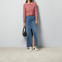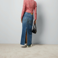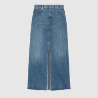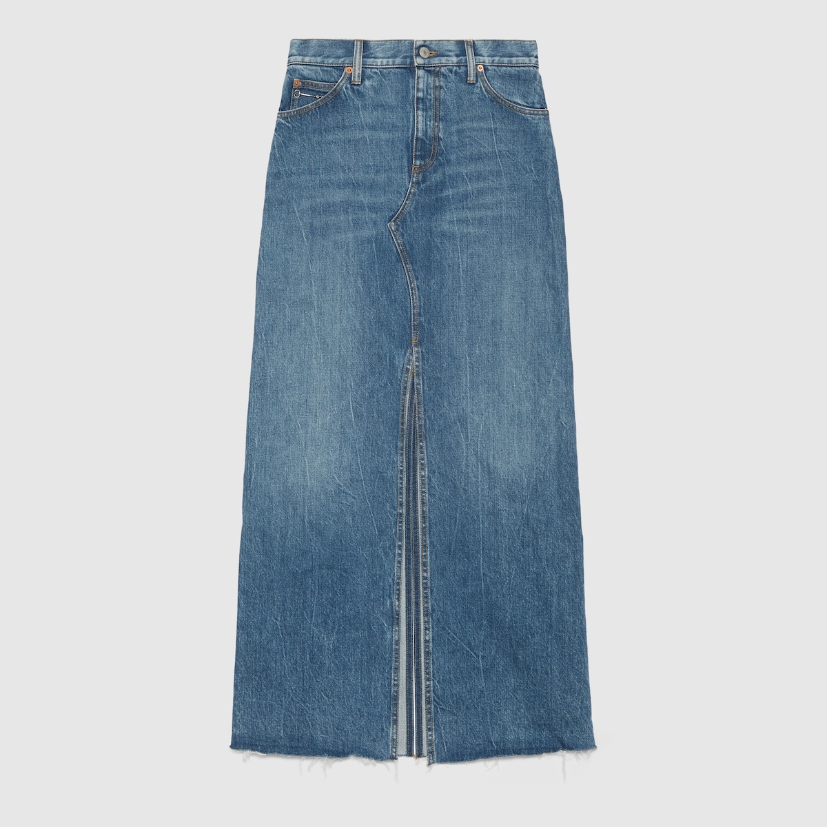 Crafted from blue organic denim, this skirt is defined by a 'Gucci Made in Italy' label on the back. The House explores new takes on the cult fabric, reinterpreting it with different designs and washing techniques that blur the line between vintage and contemporary. - Blue organic denim - Horsebit detail - Belt loops - 'Gucci Made in Italy' label - Five-pocket style - Front and back slit - Button and zip closure - Length: 40", based on a size 38 (IT) - Made in Italy - The product shown in this image is a size 38 (IT)