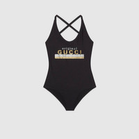 A gold and silver laminated print defines this swimsuit, crafted from black sparkling stretch jersey. The bold logo is shown throughout the Pre-Fall 2020 collection, featuring the “Original Gucci” motto. - Black sparkling stretch jersey - Gold and silver laminated "Original Gucci" print - Buttons allow the straps to be worn as crisscross back straps or as a self-tie halter - Scooped neckline - Please note that intimates, including swimwear, tights and lingerie can only be returned in new condition. Items should be unworn, in their original packaging and with all labels attached. Due to their intimate nature, these products should be tried on wearing your own clothing underneath. - 80% Polyamide, 20% Elastane - Made in Italy - The product shown in this image is a size small