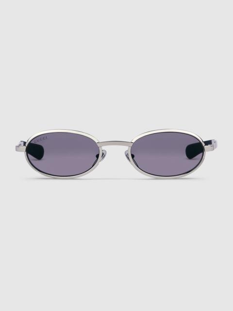 The Pre-Fall 2025 eyewear collection blends statement silhouettes from the archives with a contemporary touch. These oval frame sunglasses feature a solid grey lens and an engraved Gucci logo across the temples. - Shiny dark ruthenium-toned metal frames - Shiny dark ruthenium-toned metal temples with engraved Gucci logo - Solid grey lens - 100% UVA/UVB protection - GG1942S - Temple length: 5.3"; Lens height: 1.2"; Nose bridge length: 0.8" - Frame height 1.4"; Frame width 5.5"; Hinge to hinge 5.2" - Made in Italy - The eyewear case in the House’s signature Rosso Ancora red hue is complete with a magnetic closure and white interior.