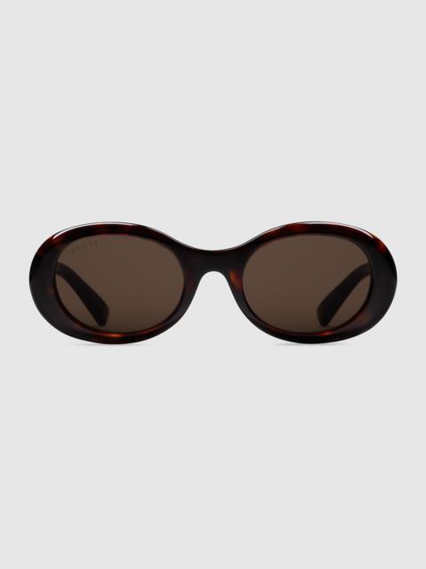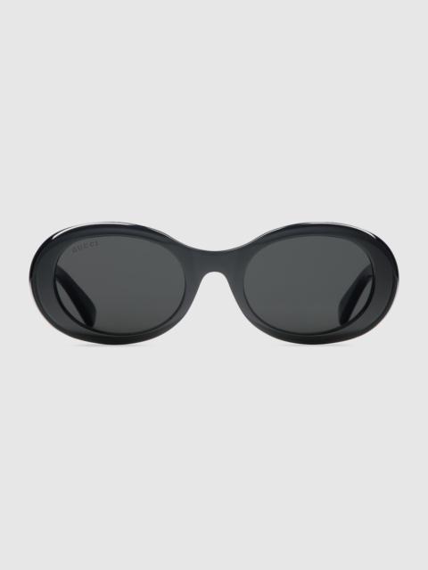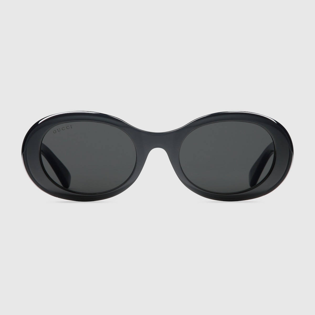 This oval shaped sunglasses are crafted from shiny black acetate. The contemporary yet vintage style is enhanced by the solid grey lenses and a gold-toned Gucci lettering on the temples. - Shiny black acetate frame - Shiny black acetate temples with Gucci lettering and stars - Solid grey lens - 100% UVA/UVB protection - GG1587S - Temple Length: 5.7", Lens height: 1.5", Nose bridge length: 0.8" - Frame height: 1.8"; Frame width: 5.7" - Made in Italy - The glasses will arrive in a velvet case, available in a range of six jewel-toned colors, and paired with a coordinating satin lining. The case color will be individually selected for each pair of glasses, and comes with a matching satin flannel pouch and ivory microfiber cloth.