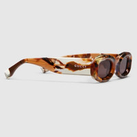 The Cruise 2025 eyewear collection crafts an oval silhouette with ReAce acetate for a contemporary design. These sunglasses feature a Gucci logo on the temples. - Shiny brown and ivory tortoiseshell acetate frame, made of ReAce, a 100% recycled acetate derived from pre consumer acetate scraps - Shiny brown and ivory tortoiseshell acetate temples with Gucci logo - Solid brown lens - 100% UVA/UVB protection - GG1907S - Temple length: 5.7"; Lens height: 1"; Nose bridge length: 0.9" - Frame height: 1.5"; Frame width: 5.7"; Hinge to hinge: 5" - Made in Italy - The eyewear case in the House’s signature Gucci Rosso Ancora red hue is complete with a magnetic closure and white interior.