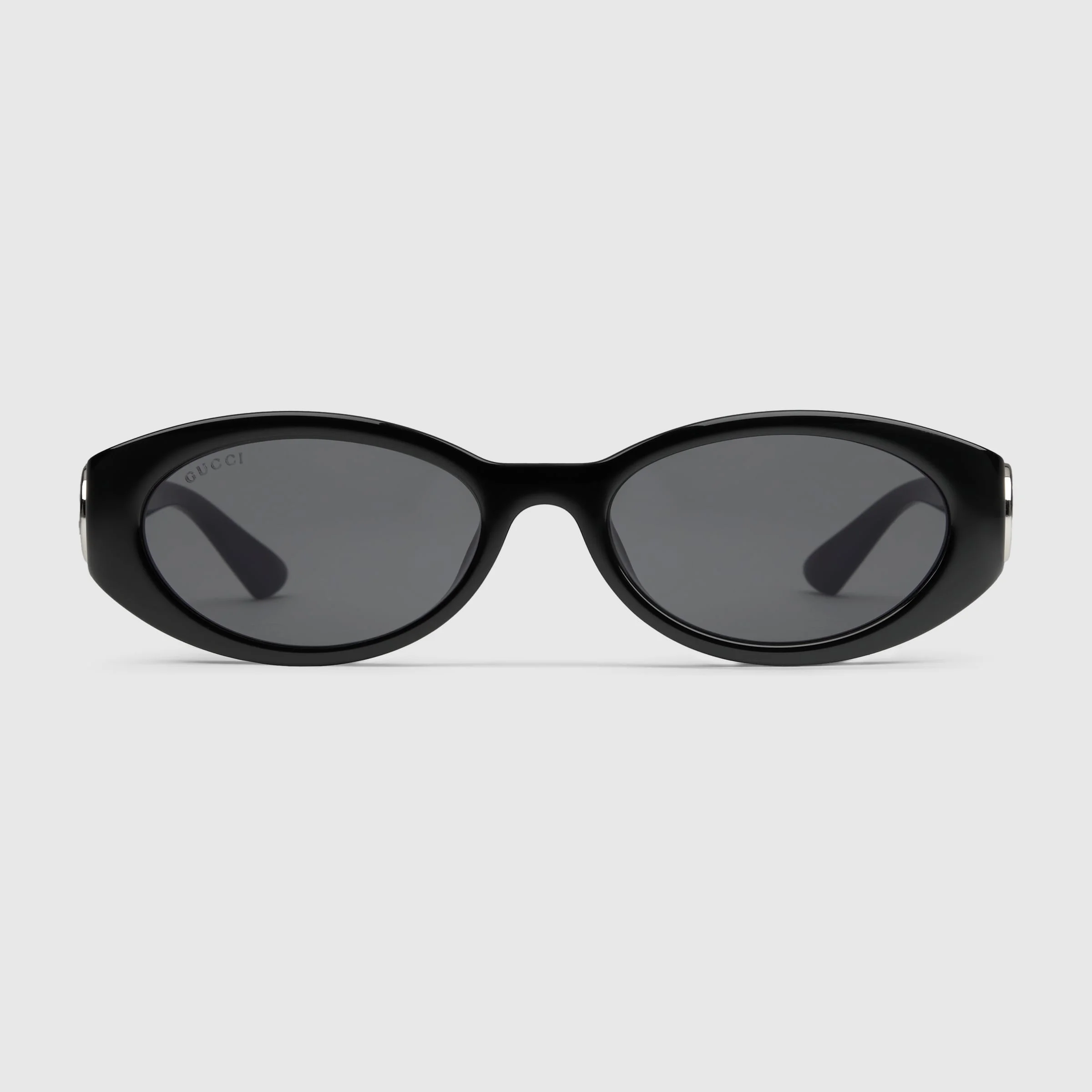 Inspired by the summer spirit and beach clubs on the Italian coast, this item is part of Gucci Lido. The Cruise 2024 eyewear collection successfully combines the coveted silhouettes of bygone decades with a contemporary logo feel. Here, a black oval injection frame pairs with an Interlocking G cut out detail. - Shiny black injection frames - Shiny black injection temples with Interlocking G cut-out detail - Solid grey lens - 100% UVA/UVB protection - GG1660S - Temple length: 5.3"; Lens height: 1.2", Nose bridge length: 0.6" - Made in Japan - The glasses will arrive in a velvet case, available in a range of six jewel-toned colors, and paired with a coordinating satin lining. The case color will be individually selected for each pair of glasses, and comes with a matching satin flannel pouch and ivory microfiber cloth.