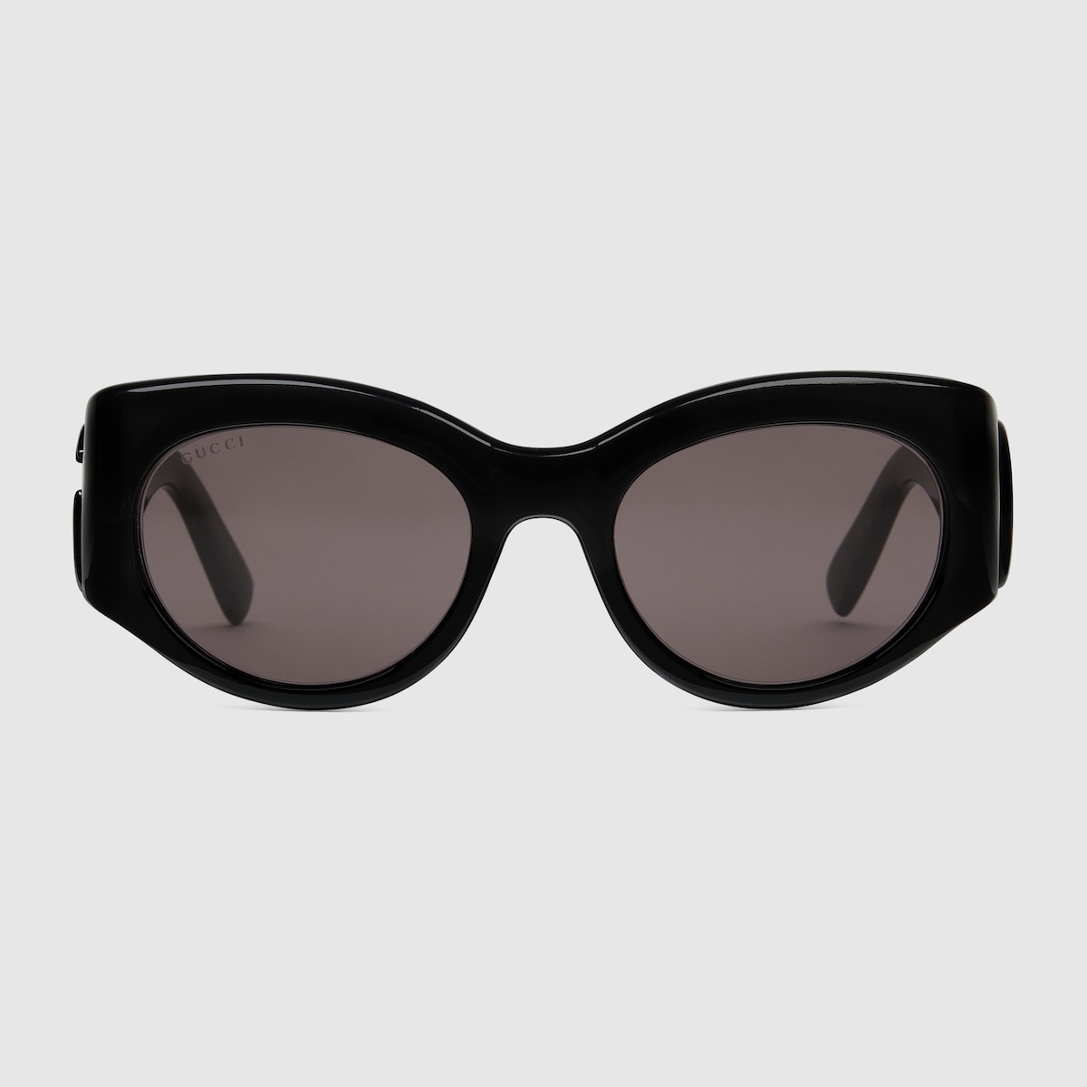 For Cruise 2024, the eyewear selection is defined by archival silhouettes reinterpreted with a contemporary touch. Here, a black oval injection frame is decorated with a tone-on-tone Double G logo detail on the temples. Solid grey lens completes the accessory. - Shiny black injection frame - Shiny black injection temples with tone-on-tone Double G logo detail - Solid grey lens - 100% UVA/UVB protection - Frame height: 2.1"; Frame width: 5.7" - GG1544S - Temple length: 0.6"; Lens height: 1.6", Nose bridge length: 0.8" - Made in Italy - The glasses will arrive in a velvet case, available in a range of six jewel-toned colors and paired with a coordinating satin lining. The case color will be individually selected for each pair of glasses and comes with a matching satin flannel pouch and ivory microfiber cloth.
