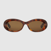 Presented in a combination of tortoiseshell acetate and brown lens, these oval-frame sunglasses feature a streamlined silhouette, accentuated by two small metal studs and enameled Gucci logo detail on the temples. - Shiny medium tortoiseshell acetate frame - Shiny medium tortoiseshell acetate temples with metal studs and enameled Gucci logo detail - Solid brown lens - 100% UVA/UVB protection - Frame height: 1.7"; Frame width: 5.7" - GG1527S - Temple length: 5.7"; Lens height: 1.4", Nose bridge length: 0.7" - Made in Italy - The glasses will arrive in a velvet case, available in a range of six jewel-toned colors, and paired with a coordinating satin lining. The case color will be individually selected for each pair of glasses, and comes with a matching satin flannel pouch and ivory microfiber cloth.