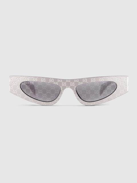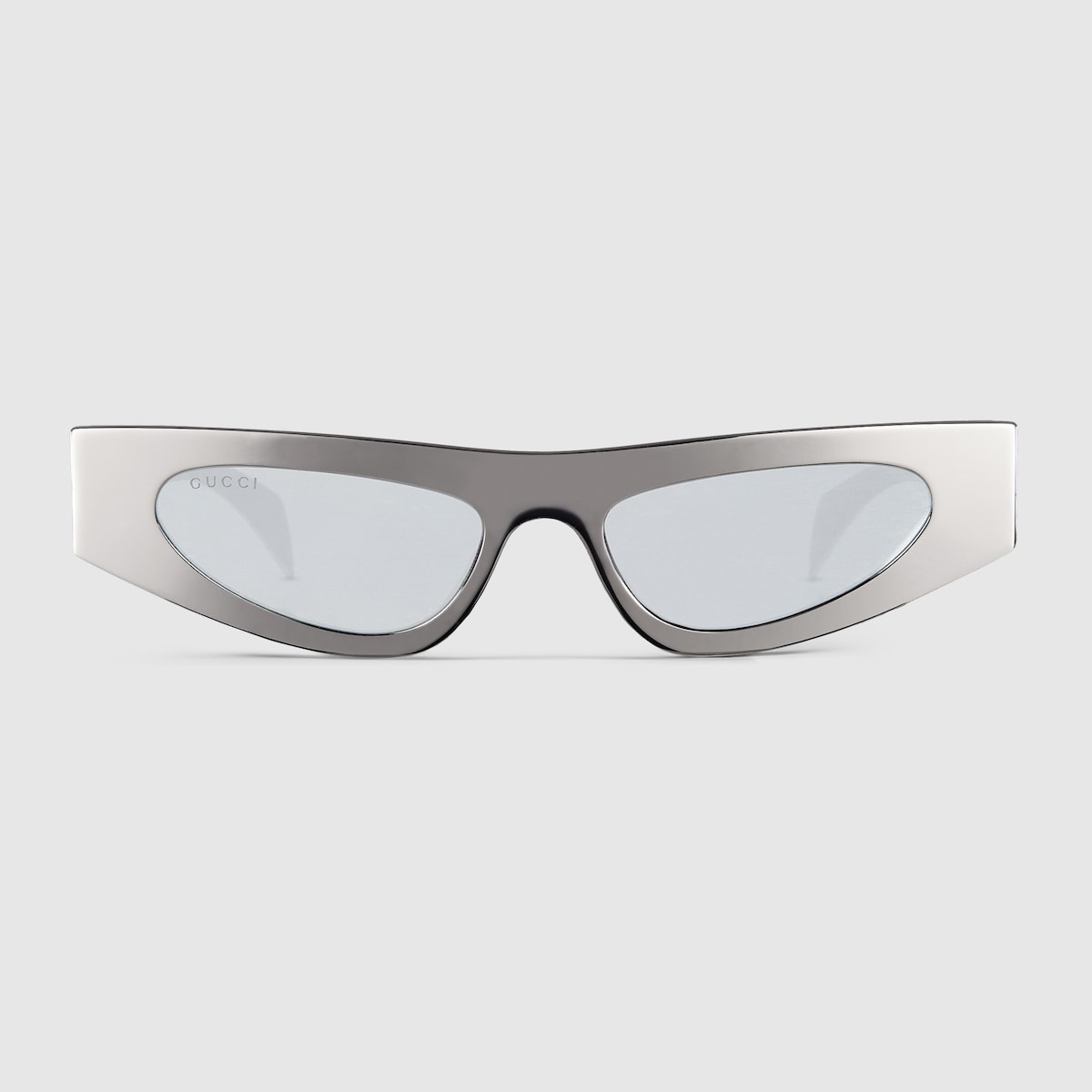 The eyewear collection puts a twist on the iconic Gucci signature silhouettes. In this cat-eye frame sunglasses, a subtle Gucci logo defines the temples, drawing inspirations from the House motif. - Shiny silver-toned metal frame - Shiny silver-toned metal temples with Gucci logo - Solid grey lens - Gucci Rosso Ancora red enamel on the inner temple and frame - 100% UVA/UVB protection - GG1916S - Temple length: 5.9"; Lens height: 1"; Nose bridge length: 0.7" - Frame height: 1.5"; Frame width: 5.6" - Made in Japan - The Rosso Ancora packaging, a distinctive color chosen by Creative Director Sabato De Sarno to mark the beginning of Gucci's new creative chapter, includes a vinyl case and satin pouch.