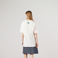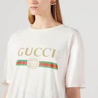 An oversize Gucci vintage logo T-shirt that was shown on the Cruise 2017 runway. This tee in cotton jersey has a weathered look and a Gucci vintage logo on the front, inspired by prints from the 1980s. Made in washed cotton jersey with small tears in the fabric for a worn effect. - White cotton jersey - Gucci vintage logo with embroidered flower appliqué on the back - Oversize relaxed fit - Length: 70cm based on a size small - Made in Italy - The model is 180 cm and is wearing size small