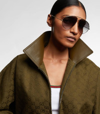 Crafted in Italy from slender metal, these Gucci glasses feature a classic aviator silhouette. The oversized design is complete with gradient lenses, temples adorned with a subtly embossed logos, and transparent tips. Product Details - Frame material: metal - Frame color: gold - Lens filter category 2 - Lens color: grey - Made in Italy - Includes: case, cleaning cloth - The color of the case may vary - Item number: P01098311 Size & Fit - Lens width: 60mm-2.35" - Bridge size: 10mm-0.4" - Earpiece length: 150mm-5.9"