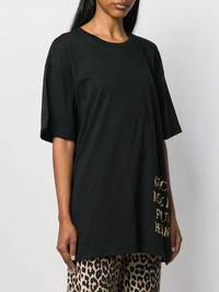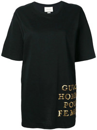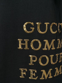 oversized sequin detail T-shirt Gucci is celebrated for their quirky graphics, whimsical prints and bold colour schemes. Case in point: this black cotton blend oversized sequin detail T-shirt. Featuring a round neck, short sleeves, an oversized fit and 'Gucci Homme Pour Femme' slogan written in gold-tone sequins at the hem. Made in Italy Composition Cotton 100%, Metallized Polyester 100%, Viscose 100% SIZE & FIT Model measurements Height 5 ft 10 in(1.77 m) Bust/Chest 31.49 in(80 cm) Hips 35.43 in(90 cm) Waist 23.22 in(59 cm) Washing instructions Hand Wash