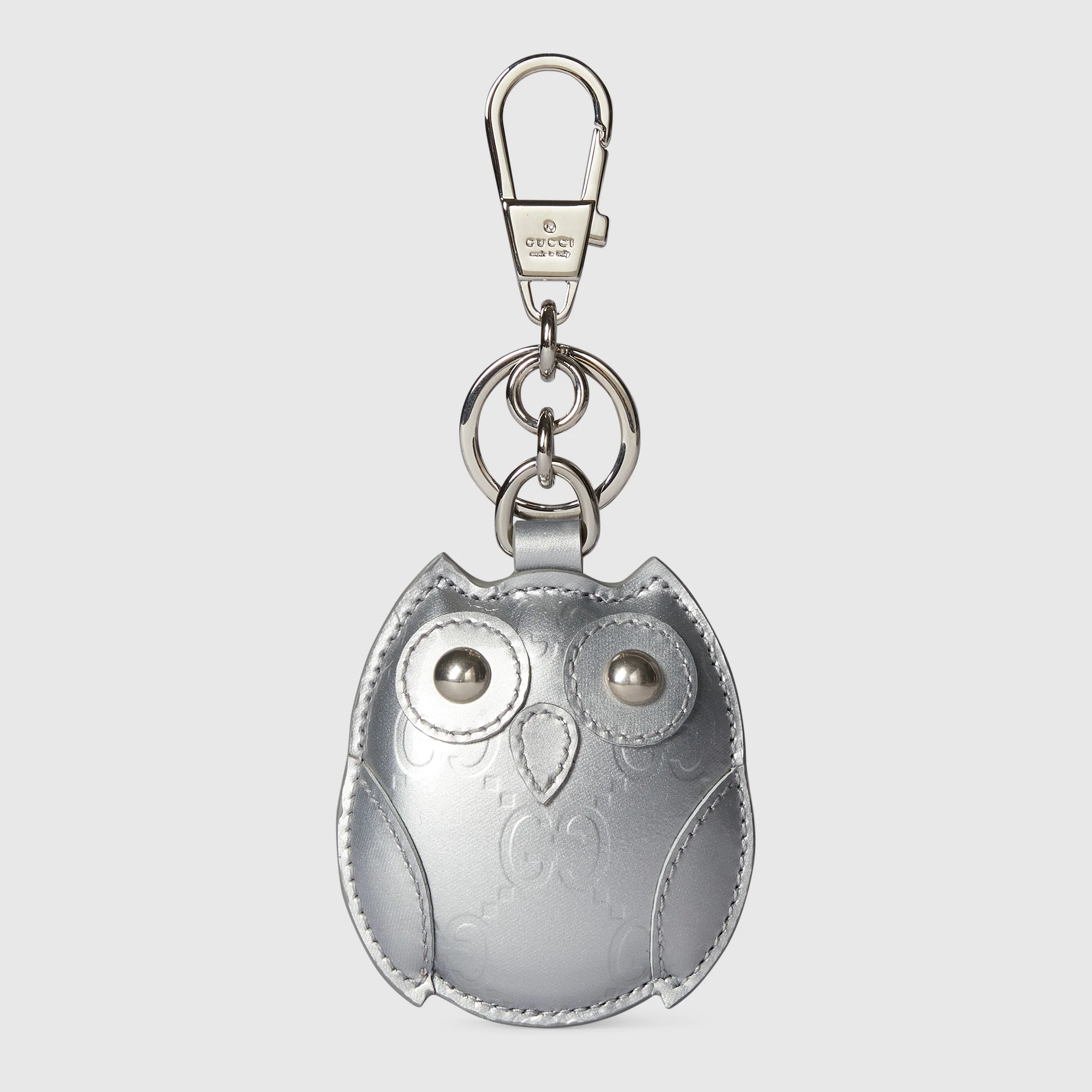 Bag charms reinterpret whimsical motifs with a sophisticated palette and sumptuous materials. This charm conjures an owl silhouette in metallic silver patent GG leather. - Metallic silver patent GG leather - Silver-toned hardware - Owl shape - Hook closure and split ring - 2.2"W x 6.3"H x 0.6"D - Weight: 1.6oz approximately - Made in Italy