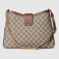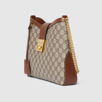 Drawing from the House's origins as an artisanal luggage atelier, the Padlock closure features prominently on this shoulder bag in GG Supreme canvas. It is complete with gold-toned hardware, smooth brown leather trim, a chain and leather shoulder strap. - Beige and ebony GG Supreme canvas - Brown leather trim - Gold-toned hardware - Brown microfiber lining - Leather and chain shoulder strap, adjustable from 21.7" to 27.6" - Inside: 1 zip pocket - Shoulder strap with 10.6" - 13.8" drop - Padlock closure - Medium: 12.8"W x 9.4"H x 2.2"D - Weight: 1.5lbs, approximately - Made in Italy - Fits up to: iPhone Pro Max/Plus, Airpods, long wallet, and lipstick