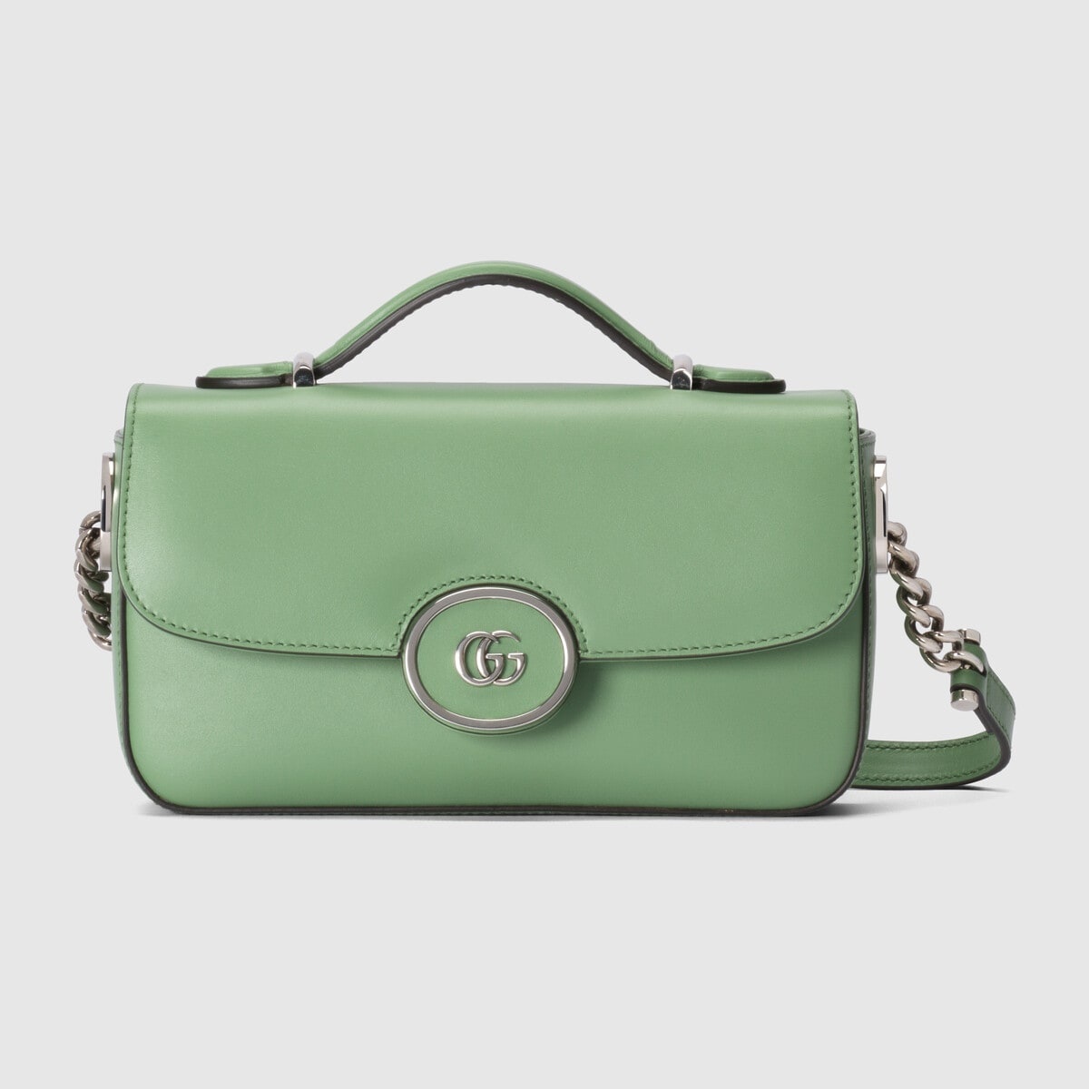 Representing the emblematic styles dear to the House, the Petite GG is characterized by the unmistakable mini Double G hardware. Here, this small shoulder bag is presented in light green leather with a palladium-toned hardware. - Light green leather - Palladium-toned hardware - Microfiber lining with suede-effect finish - Double G - Inside: 1 zip pocket - Adjustable and detachable leather shoulder strap with 17.7" drop - Push lock closure - Mini size: 8.2"W x 3.9"H x 1.9"D - Made in Italy