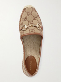 Gucci's 'Pilar' espadrilles are embellished with the house's signature horsebit hardware. They're made from lightweight canvas that's jacquard-woven with the 'GG' monogram and trimmed with supple leather. Size & Fit - Fits true to size, take your normal size - Italian sizing Details & Care - Slight heel - Beige and brown logo-jacquard canvas, brown leather (Calf) - Slip on