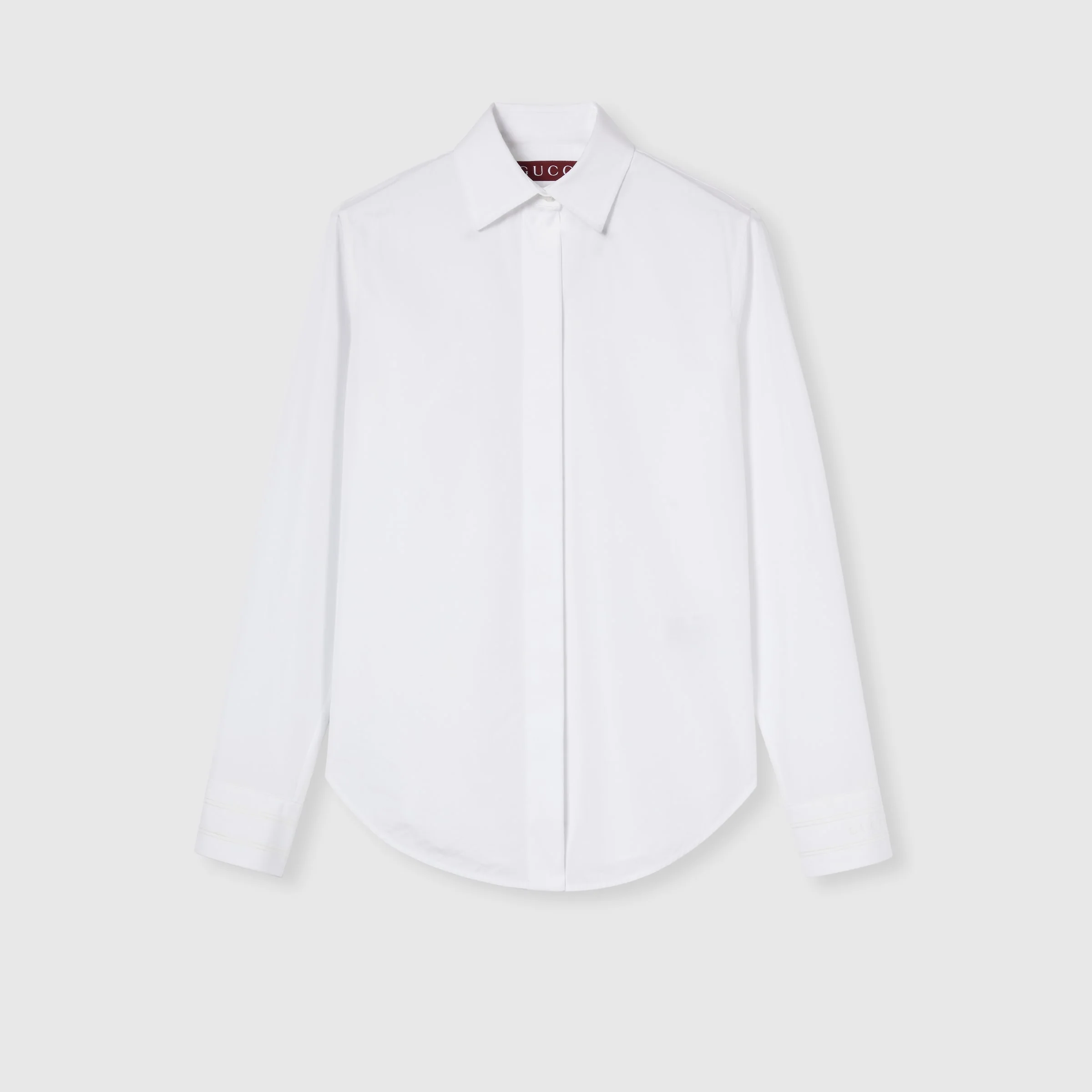 A monochrome palette with subtle details, such as embroideries or logo hardware, transitions the wardrobe from day to night in a selection of pieces from the Pre-Fall 2025 collection. This classic cotton poplin shirt features a front placket concealing the button closure and is complete with a Gucci embroidery. - White cotton poplin - Gucci embroidery - Unlined - Point collar - Hidden button closure - Made in Italy - Fabric: 100% Cotton - Embroidery: 100% Polyester