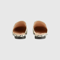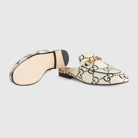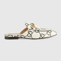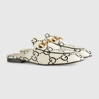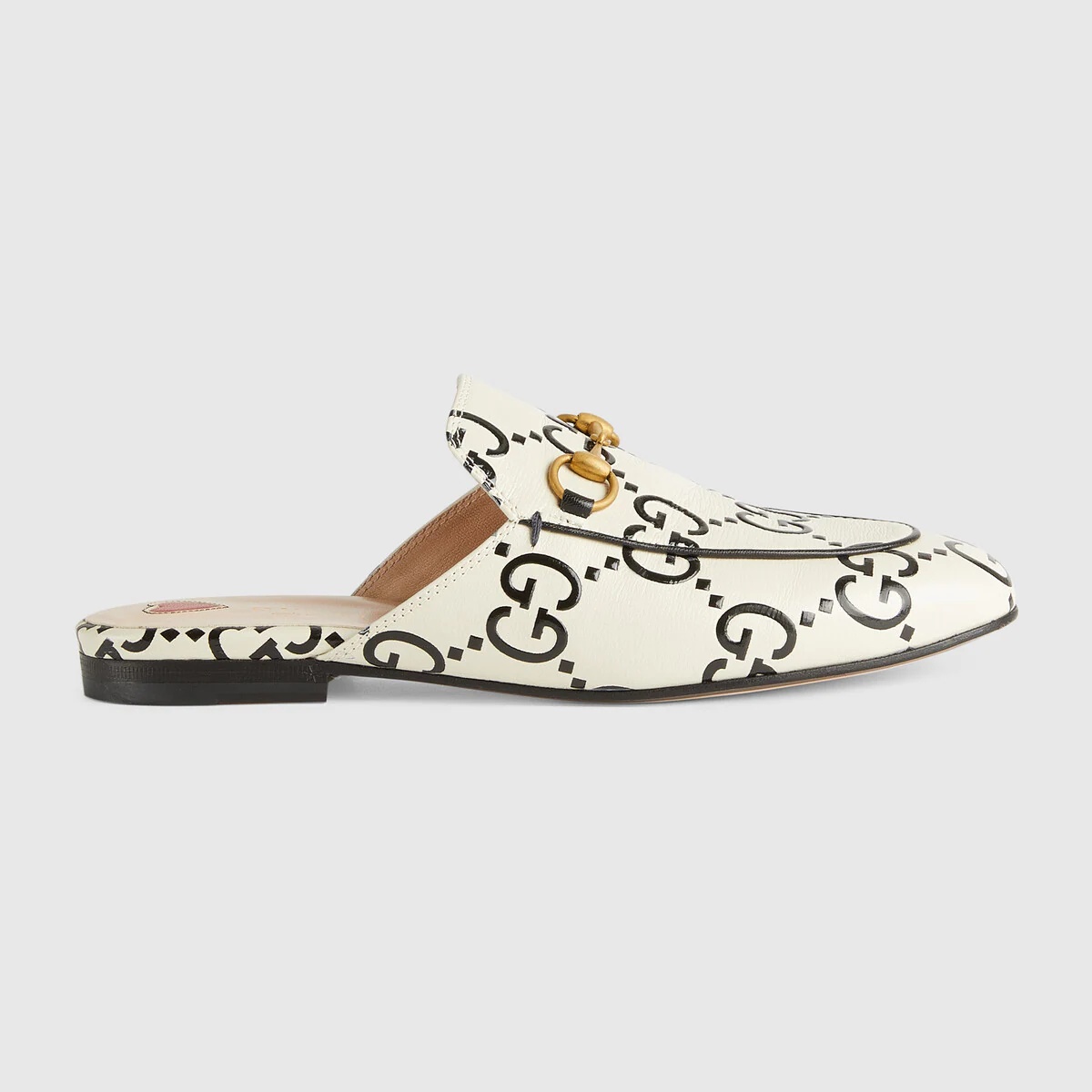 House codes evolve each season, reimagined to tell the next part of Gucci's story. Inspired by the Gucci rhombi from the '30s, the GG pattern has appeared throughout the brand's history. Presented in white and black, this pair of Princetown slippers is crafted from debossed GG leather— a new interpretation of the motif. - White and black debossed GG leather - Women's - Gold-toned hardware - Horsebit detail - Leather sole - Flat - .4" heel height - Made in Italy - These shoes run small, we recommend sizing up half a size
