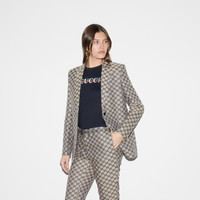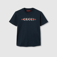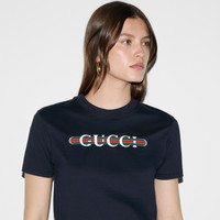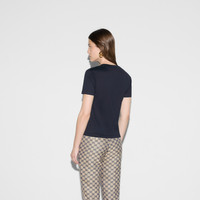 Inspired by the summer spirit and beach clubs on the Italian coast, this item is part of Gucci Lido. Emblematic codes of the House and refined patterns are reinterpreted in contemporary ways for the Pre-Fall collection. This T-shirt is presented in navy light cotton jersey and enriched with a Gucci Web print. - Navy light cotton jersey - Gucci Web print - Crewneck - Short sleeves - Slim fit - Length: 21.2", based on a size small - Made in Italy - The product shown in this image is a size small
