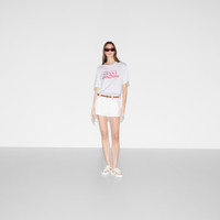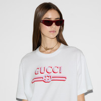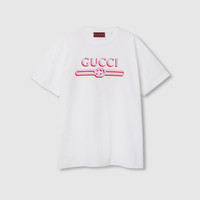 Gucci's House codes continue to evolve for the new season across relaxed T-shirts and jersey pieces. This regular fit T-shirt has been crafted from a cotton jersey and reveals a Gucci vintage logo print. - White cotton jersey - Gucci vintage logo print - Crewneck - Dropped shoulder - Short sleeves - Rib trim - Regular fit - Length: 28.5"; Shoulder: 19.1"; Chest: 21.3"; Sleeves length: 8.3" based on a size s - Made in Italy - The model is 5'9" and is wearing size small