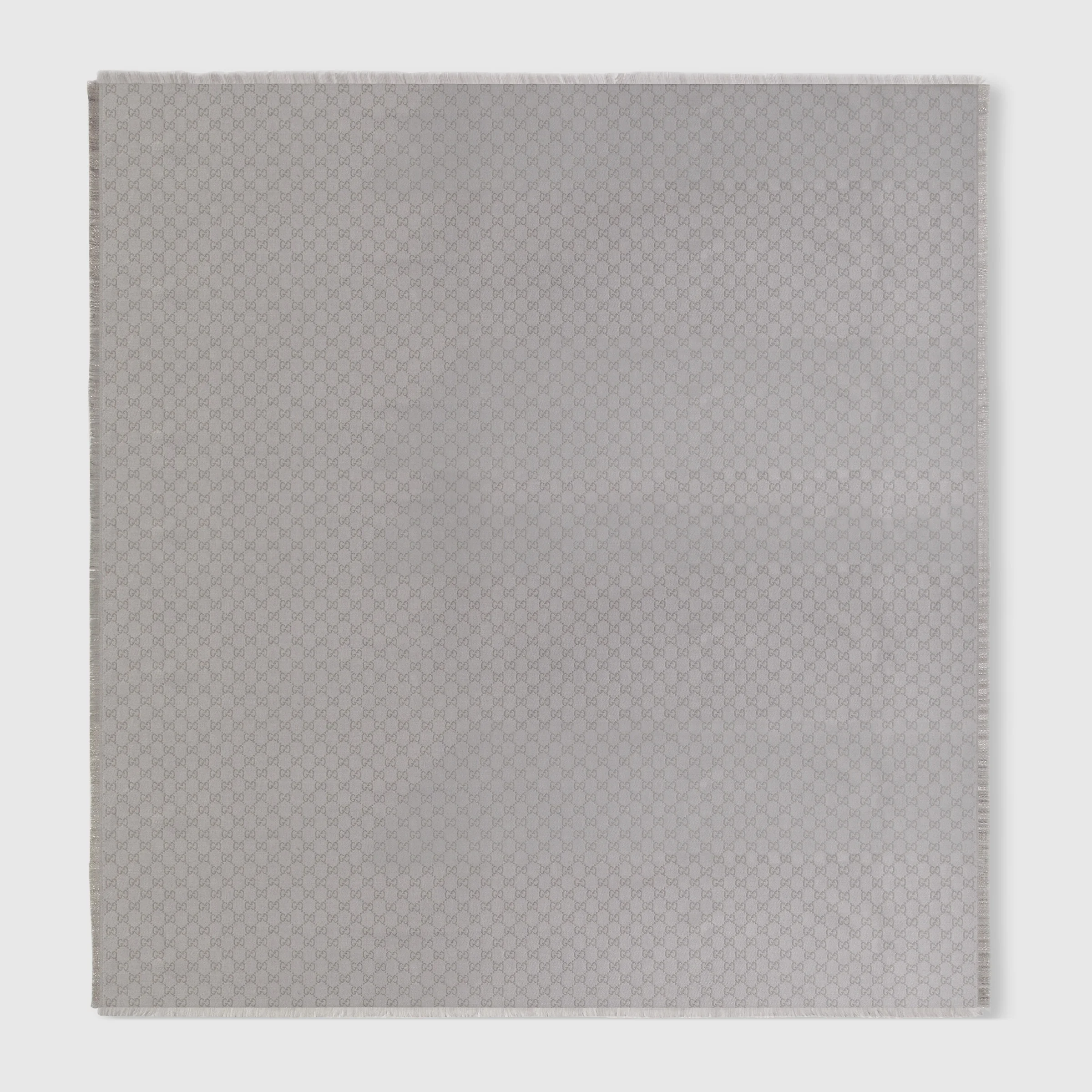 In the Fall Winter 2025 collection, this signature GG motif returns in soft shades. This shawl has been crafted from a GG viscose cotton wool silk lame jacquard. - Light grey GG viscose cotton wool silk lame jacquard - 51.1"W x 51.1"L