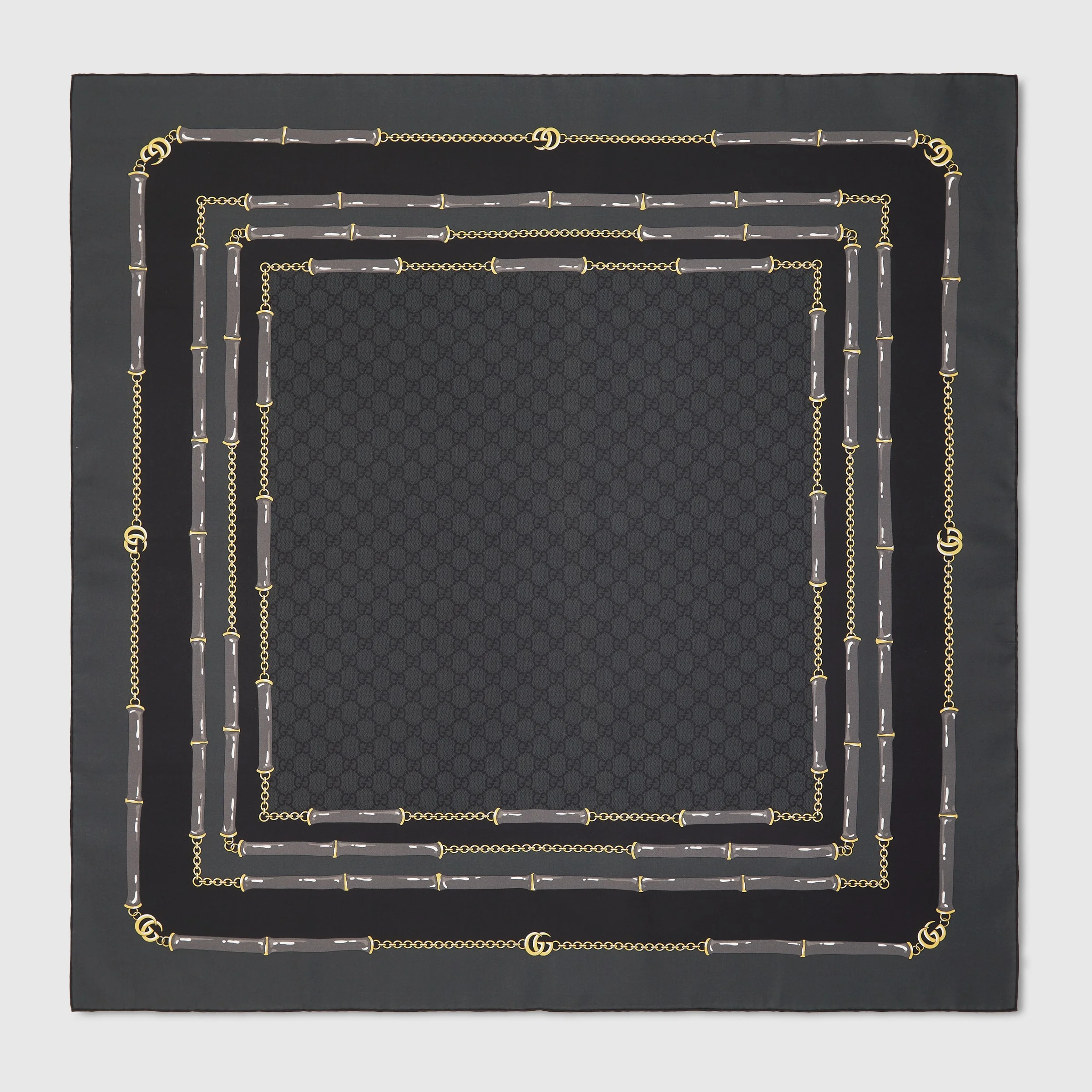Horsebit details and riding motifs in sophisticated tones pay homage to the House's link with the equestrian world. This carre has been crafted from a GG silk jacquard and features an allover GG and Double G bamboo print. - Black GG silk jacquard - Allover GG and Double G bamboo print - 35.4"W x 35.4"L - The dimensions of this item may vary slightly as the hem is hand-sewn