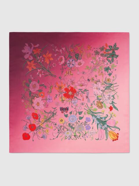 The Pre-Fall 2025 soft accessories collection animate House codes through sophisticated trimmings, logo patches and subtle embroideries. Presented in a silk twill, this carre reinterprets Gucci's Flora motif in fresh hues. - Gradient lilac silk twill - Allover Flora print - 35.4"W x 35.4"L - Made in Italy - The dimensions of this item may vary slightly as the hem is hand-sewn