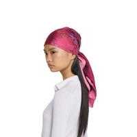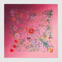 The Pre-Fall 2025 soft accessories collection animate House codes through sophisticated trimmings, logo patches and subtle embroideries. Presented in a silk twill, this carre reinterprets Gucci's Flora motif in fresh hues. - Gradient magenta silk twill - Allover Flora print - 35.4"W x 35.4"L - Made in Italy - The dimensions of this item may vary slightly as the hem is hand-sewn
