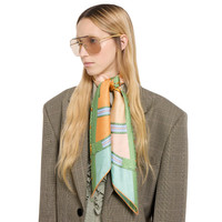 The House's silk accessories collection continues to reinterpret emblematic motifs, from the GG, Web, Flora, bamboo, Horsebit and equestrian inspirations, in sumptuous materials, intricate craftsmanship, and fresh hues. This carre is presented in a GG silk jacquard, playing with a balance of complementary hues. - Pale mint green and orange GG silk jacquard - 35.4"W x 35.4"L - Made in Italy - The dimensions of this item may vary slightly as the hem is hand-sewn - Main fabric: silk 100%