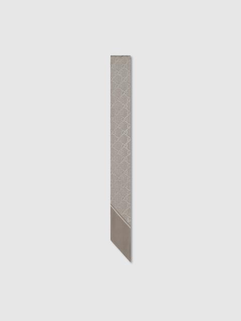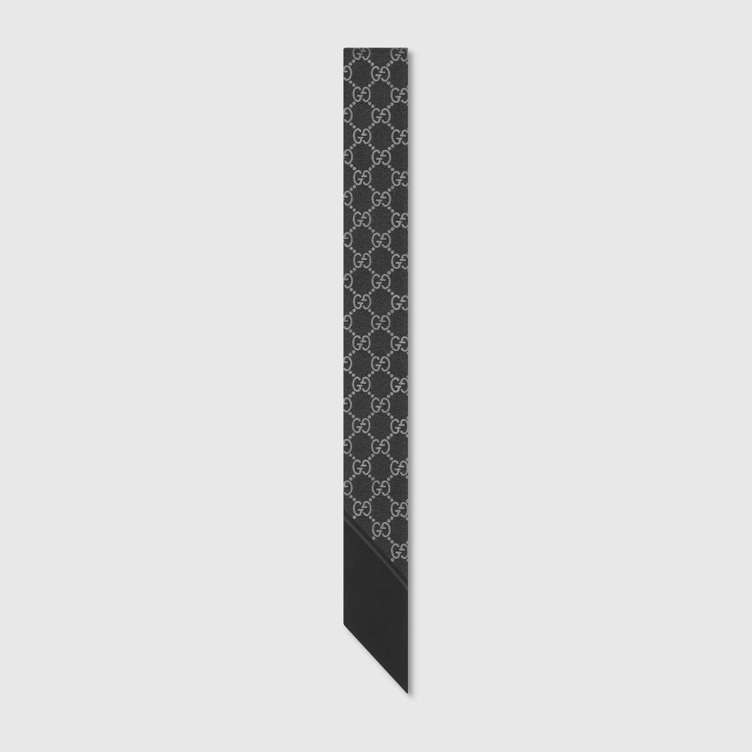 The Pre-Fall 2025 collection presents the GG motif across a wide selection of silk accessories that can be layered. Crafted from silk, this neck bow is completed with a lame GG print. - Black silk twill - Black trim - Allover lame GG print - 2"W x 47.3"L - Made in Italy