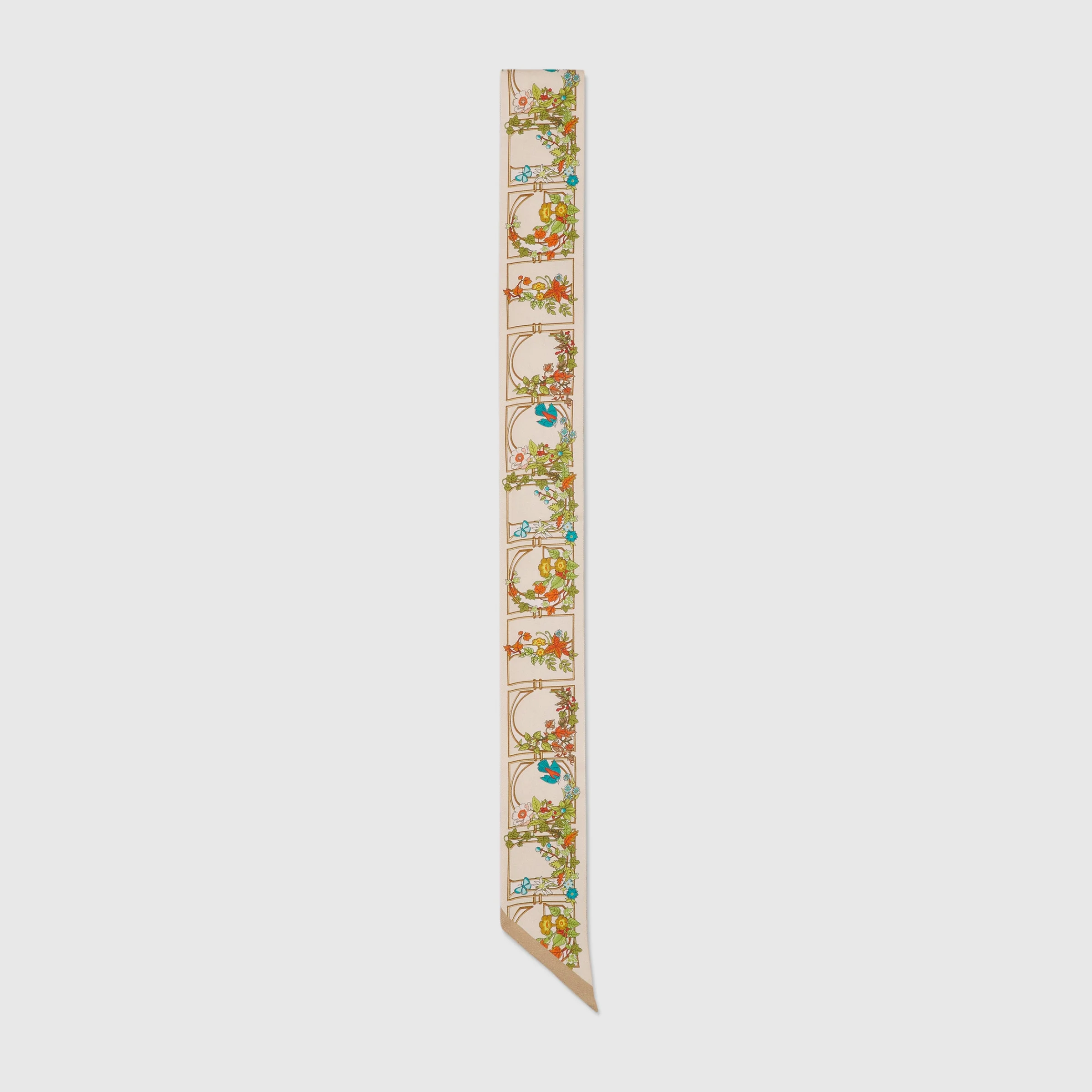 The historical Flora print is reimagined for the Cruise 2025 collection. Floral patterns appear on a selection of silk and soft accessories in pastel hues, adding a romantic feel to the pieces. This neck bow has been crafted from silk and defined by an allover Gucci, flowers and animals in the garden print. - Ivory and multicolor silk - Allover Gucci, flowers and animals in the garden print - 2"W x 47.2"L - Made in Italy