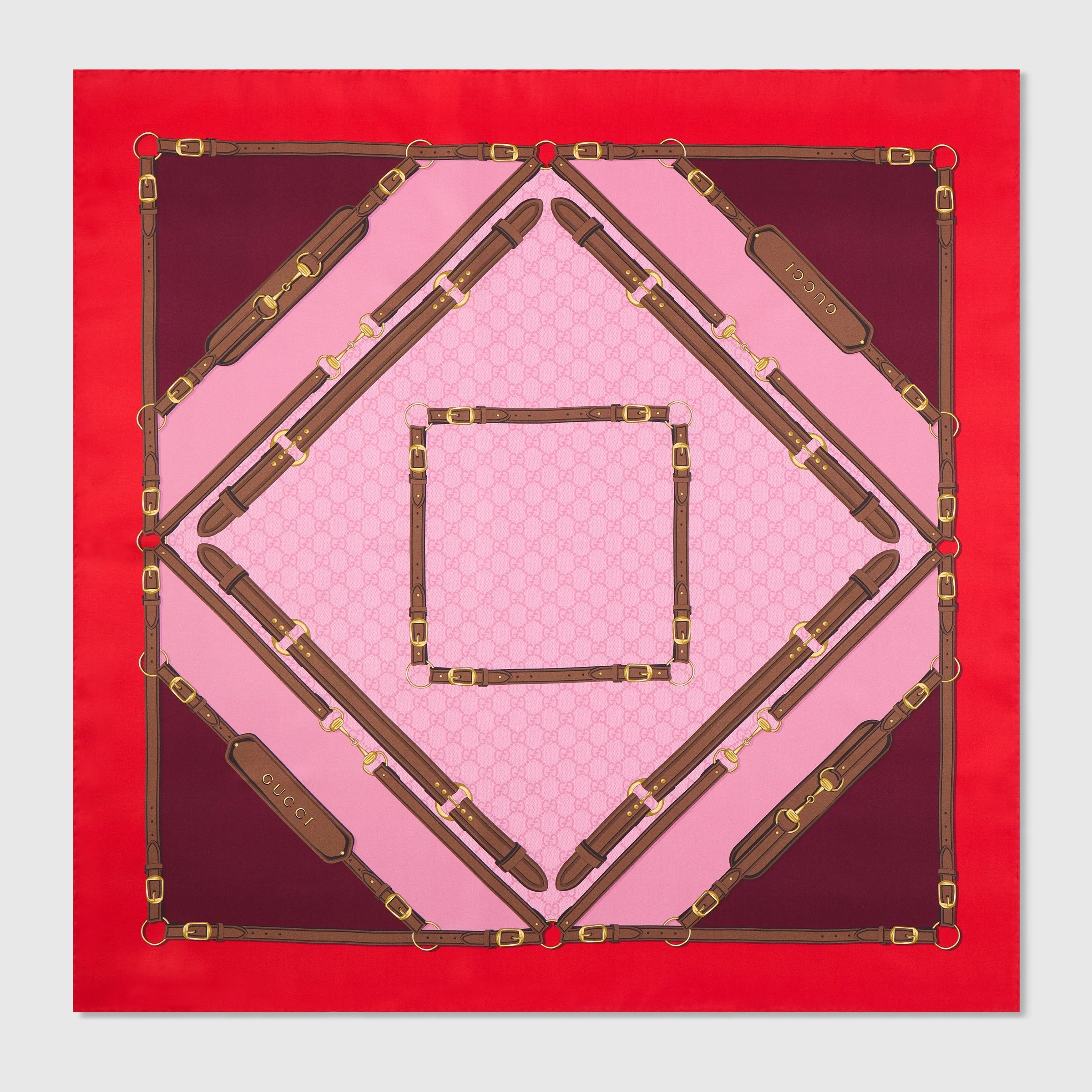In the Fall Winter 2025 collection, the House celebrates its roots, including this silk carre with an allover Gucci belts and Horsebit print. - Pink and red silk twill - Allover Gucci belts and Horsebit print - 35.4"W x 35.4"L - The dimensions of this item may vary slightly as the hem is hand-sewn