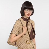 Introducing Spring Summer 2026. Silk and soft accessories designs continue to reinterpret emblematic codes through a creative lens in the La Famiglia collection. Stated in a silk twill, this carre is defined by an allover GG print. - Brown and light brown silk twill - Allover GG print - 35.4"W x L35.4"L - Made in Italy - The dimensions of this item may vary slightly as the hem is hand-sewn - Main fabric: silk 100%