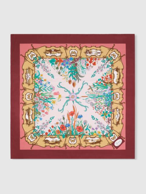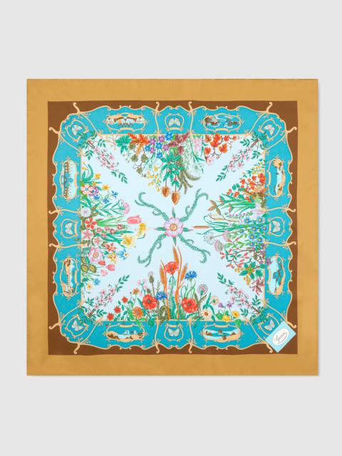 In the Fall Winter 2025 collection, this silk twill carre reveals an allover Gucci Italian garden print. - Multicolor and dark blue silk twill - Allover Gucci Italian garden print - 35.4"W x 35.4"L - The dimensions of this item may vary slightly as the hem is hand-sewn
