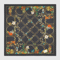 The historical Flora print is reimagined for the Cruise 2025 collection. Floral patterns appear on a selection of silk and soft accessories in pastel hues, adding a romantic feel to the pieces. This silk carre has been crafted from silk and defined by an allover floral GG Gucci print. - Black silk twill - Allover floral GG Gucci print - 35" x 35" - Made in Italy - The dimensions of this item may vary slightly as the hem is hand-sewn