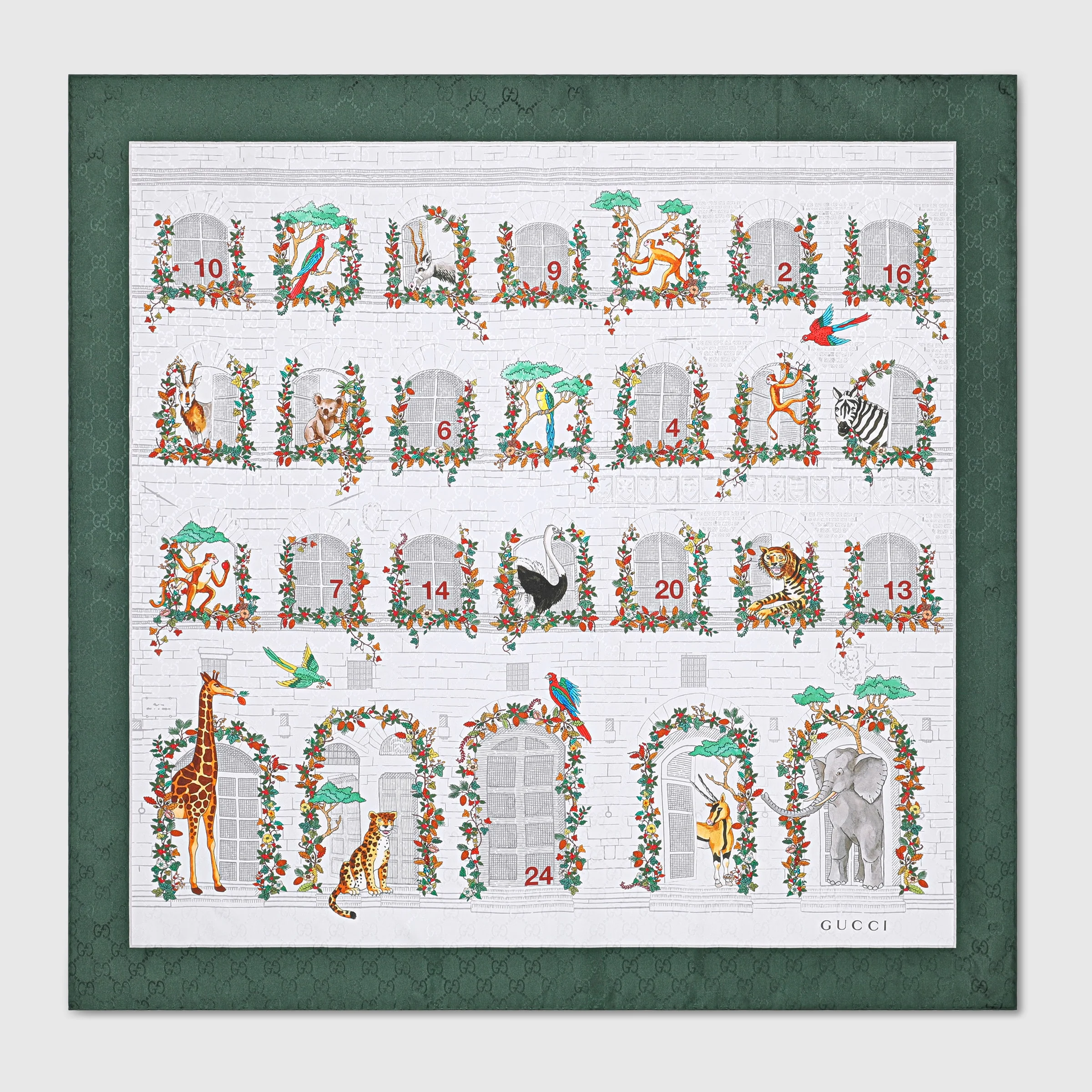 The House's silk accessories collection continues to reinterpret emblematic motifs, from the GG, Web, Flora, bamboo, Horsebit and equestrian inspirations, in sumptuous materials, intricate craftsmanship, and fresh hues. An advent calendar and animal print defines this lightweight silk twill carre. - Dark grey and dark green silk twill - Advent calendar and animals print - 35.4"W x 35.4"L - The dimensions of this item may vary slightly as the hem is hand-sewn