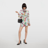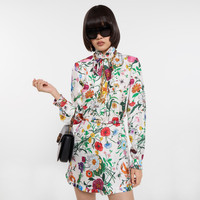Introducing Spring Summer 2026. This style is inspired by the "La Flora" look of La Famiglia. The collection reinterprets the House’s codes through singular personalities and distinctive aesthetic attitudes. Crafted from silk twill, this dress is defined by an allover Gucci Flora print. - Multicolor silk twill - Ruffles trim - Allover Gucci Flora print - Unlined - Self-tie bow - Detachable belt with Double G buckle - Long sleeves - Covered buttons - Length: 31.1", based on a size 38(IT) - Made in Italy - Removable leather belt: Cow leather - Fabric: 100% Silk - Removable belt: 100% Silk
