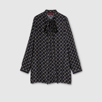 The Cruise 2026 women's ready-to-wear collection reimagines archival motifs with innovative prints, in a vibrant palette. Crafted from white silk twill, this dress is defined by an allover Gucci Horsebit print. - Black silk twill - Allover Gucci Horsebit print - Unlined - Self-tie neck bow - Long sleeves - Button closure - Length: 34.2"