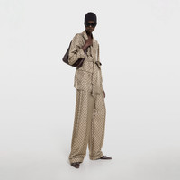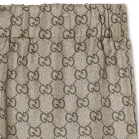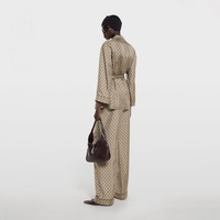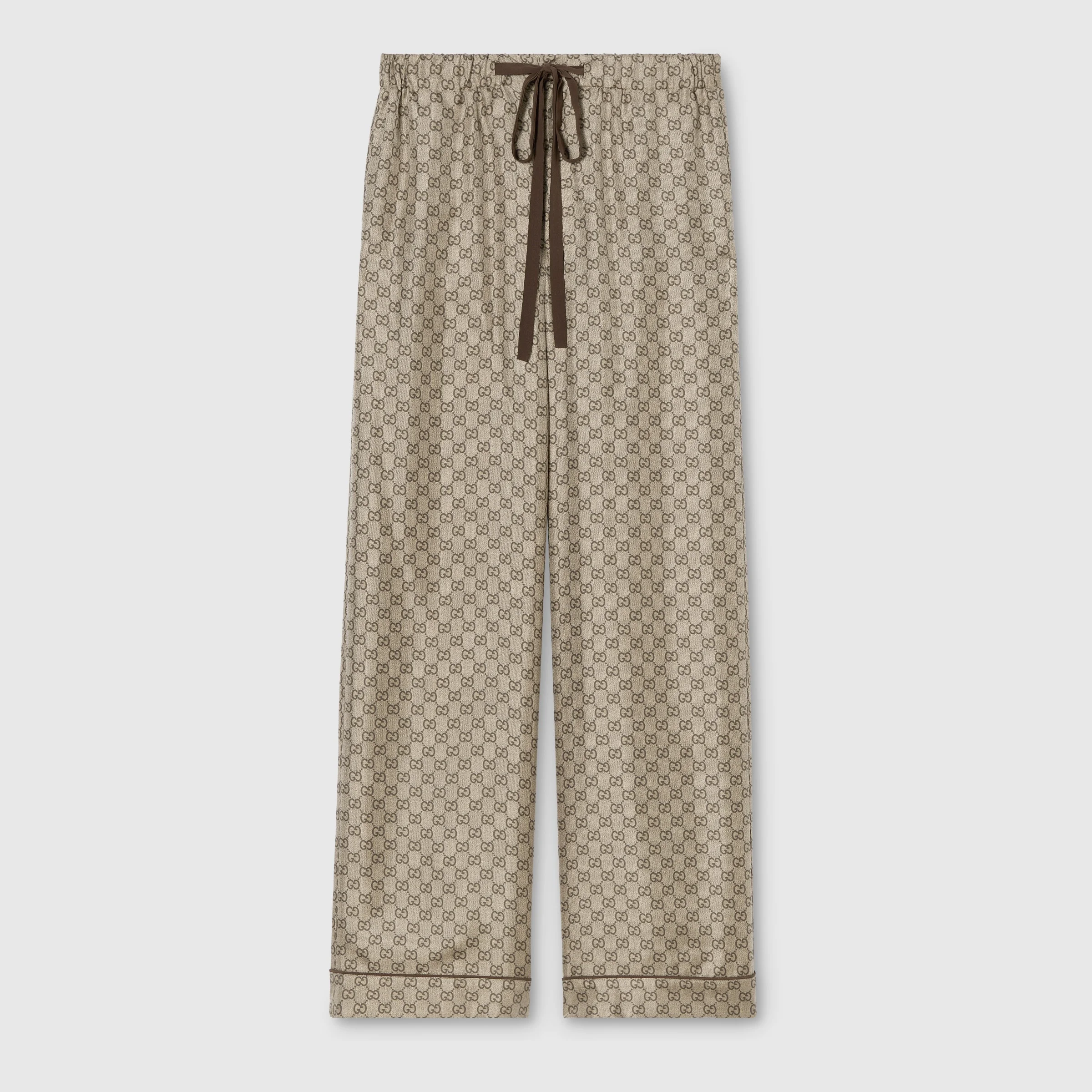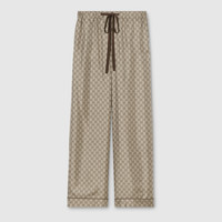Introducing Spring Summer 2026. This style is inspired by the "La Primadonna" look of La Famiglia. The collection reinterprets the House’s codes through singular personalities and distinctive aesthetic attitudes. Crafted from silk twill, these leisure pants are defined by an allover GG print. - Beige and dark brown silk twill - Piping trim - Allover GG print - Unlined - Elastic waistband with drawstring - Length: 43.3" Leg opening: 23.6", based on a size 40(IT) - Made in Italy - Fabric: 100% Silk