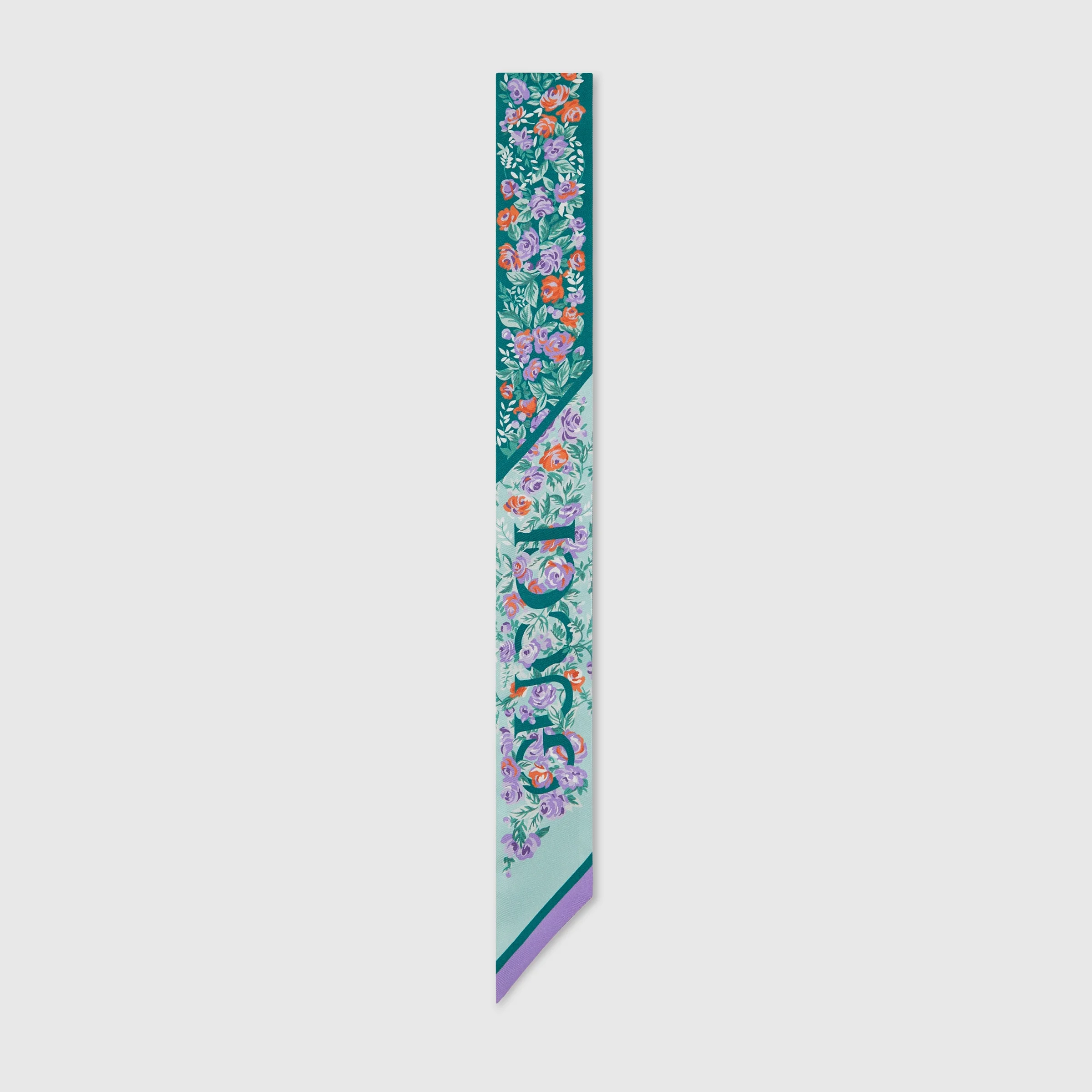 The House's silk accessories collection continues to reinterpret emblematic motifs, from the GG, Web, Flora, bamboo, Horsebit and equestrian inspirations, in sumptuous materials, intricate craftsmanship, and fresh hues. Stated in a playful aquamarine and lilac silk twill, this ribbon reveals a Gucci floral print. - Aquamarine and lilac silk twill - Allover Gucci floral print - 2"W x 47.2"L - Made in Italy - Main fabric: silk 100%