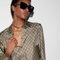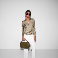 Classics such as elegant shirts and tailored jackets throughout the Cruise 2025 collection stand out with subtle details that elevate everyday looks. This relaxed shirt has been presented in a silk twill and reveals an allover GG print. A contrasting piped trim completes the silhouette. - Camel and dark brown silk twill - White piping trim - Self-covered buttons - Allover GG print - Point collar - Long sleeves - Made in Italy - The product shown in this image is a size 38 (IT)