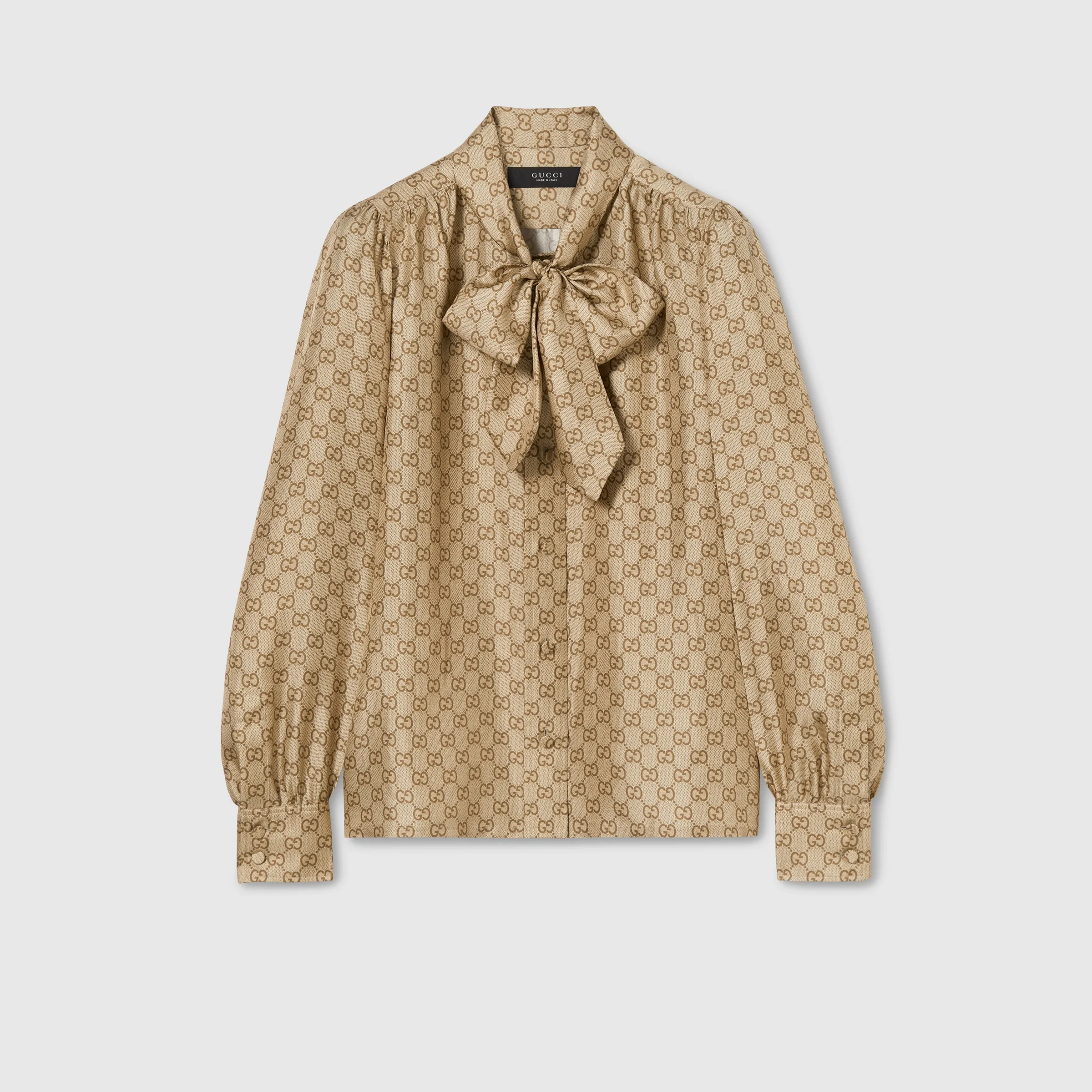 Introducing Spring Summer 2026. This style is featured as part of the "La V.I.P." look of La Famiglia, which reinterprets the House’s codes through singular personalities and distinctive aesthetic attitudes. Crafted from silk twill, this shirt is defined by an allover GG print. - Sand silk twill - Allover GG print - Self-tie bow - Front button closure - Length: 23.4", based on a size 38(IT) - Made in Italy - Fabric: 100% Silk
