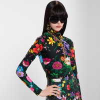 Introducing Spring Summer 2026. This style is inspired by the "La Contessa" look of La Famiglia. The collection reinterprets the House’s codes through singular personalities and distinctive aesthetic attitudes. Crafted from sparkling jersey, this turtleneck top is defined by an allover Gucci Flora print. - Multicolor sparkling jersey - Allover Gucci Flora print - Turtleneck - Long sleeves - Back hidden zip closure - Length: 21.3", based on a size XS - Made in Italy