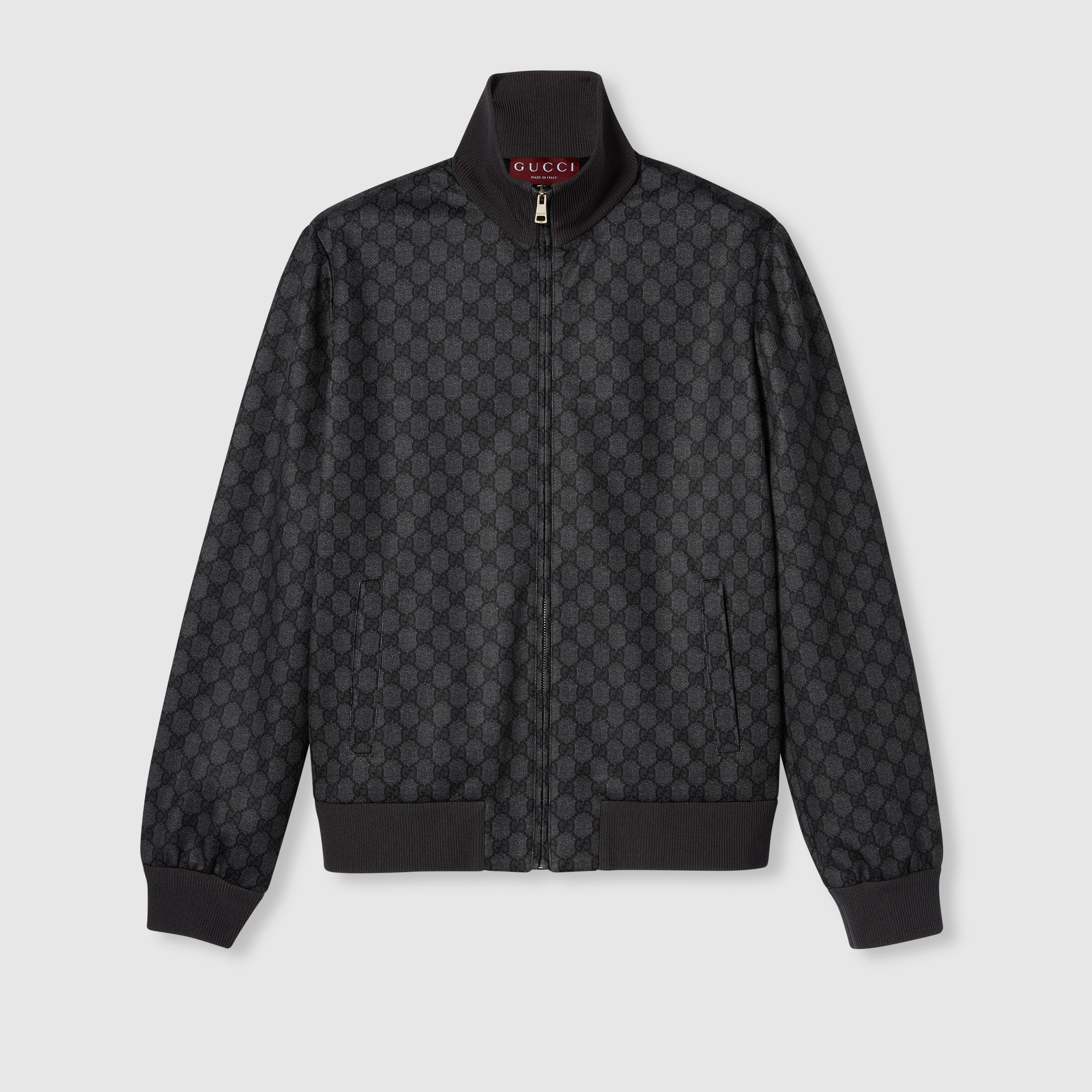 The Pre-Fall 2025 collection perfectly blends versatile textures and sophisticated detailing to reflect the changing seasons. Here, the GG motif defines this technical jersey zip sweatshirt. - Black technical jersey - Allover GG print - Stand collar - Long sleeves - Knit rib trim - Two side pockets - Zip closure - Made in Italy