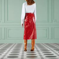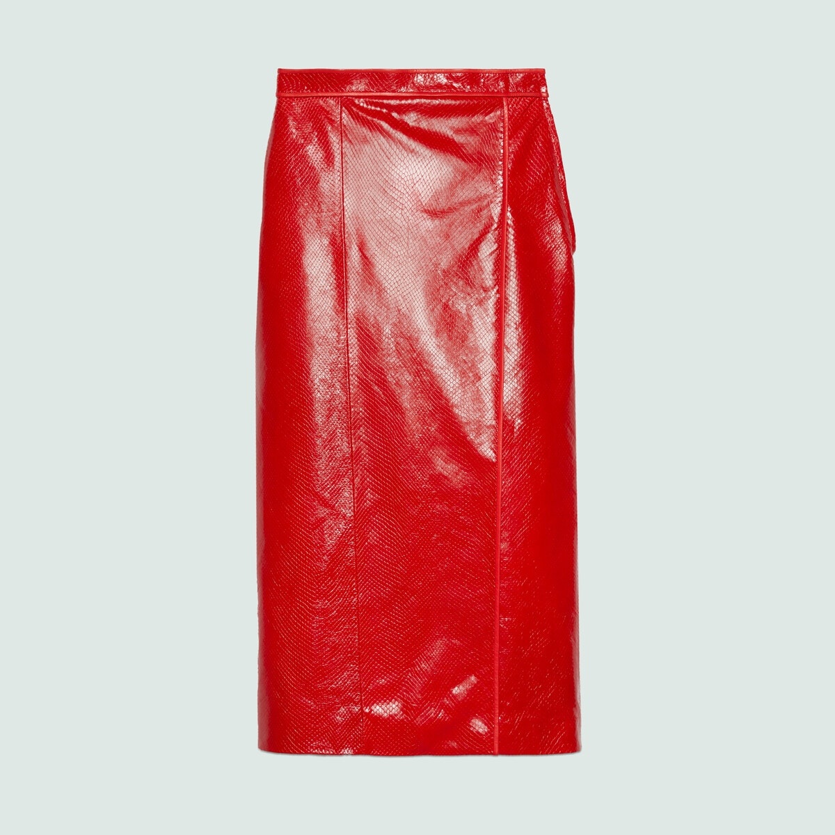 From a refined '50s style to the freedom of the '60s and wild energy of the '70s punk scene, animal prints have appeared throughout history as a powerful form of self-expression. Introduced at first as part of Gucci Love Parade, python print leather keeps defining a selection of items also in the new collection Exquisite Gucci. - Red laser python print leather - Pink roses silk jacquard lining - Regular waist - Front slit - Side zip closure - Length: 32.6" based on a size 38 (IT) - Made in Italy - The product shown in this image is a size 38 (IT)