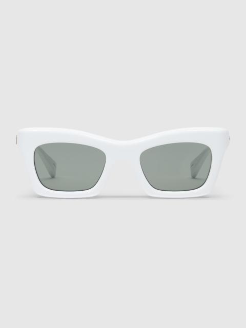 Inspired by the summer spirit and beach clubs on the Italian coast, this item is part of Gucci Lido. This pair of black sunglasses is crafted in shiny acetate. The rectangular-shaped frame is enhanced by a gold-toned Gucci script detail on the temples, while the solid grey lenses complete the style. - Shiny black acetate frame - Shiny black acetate temples with gold-toned Gucci script - Solid grey lens - 100% UVA/UVB protection - Frame height: 1.7"; Frame width: 5.7" - GG1773S - Temple length: 5.5"; Lens height: 1.4", Nose bridge length: 0.8" - Made in Italy - The Rosso Ancora packaging, a distinctive color chosen by Creative Director Sabato De Sarno to mark the beginning of Gucci's new creative chapter, includes a vinyl case and satin pouch.