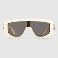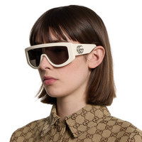 The Pre-Fall 2025 eyewear collection successfully combines the coveted silhouettes of bygone decades with a contemporary logo feel. Here, an ivory acetate frame pairs with a Double G detail. - Shiny ivory acetate frames - Shiny ivory acetate temples with Double G detail - Brown lens - 100% UVA/UVB protection - GG1950S - Temple length: 5.1"; Lens height: 1.8" - Frame height: 1.8"; Frame width: 5.6"; Hinge to hinge: 5.1" - The glasses will arrive in a velvet case, available in a range of six jewel-toned colors and paired with a coordinating satin lining. The case color will be individually selected for each pair of glasses and comes with a matching satin flannel pouch and ivory microfiber cloth.