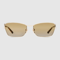The House's eyewear collection continues to reinterpret emblematic motifs, from the GG, Web, bamboo, Horsebit and equestrian inspirations, in sumptuous materials, intricate craftsmanship, and fresh hues. Set in a gold-toned metal frame, these rectangular frame sunglasses reveal an Interlocking G detail across the temples. - Shiny gold-toned metal frame - Shiny gold-toned metal temples with Interlocking G and brown tortoiseshell acetate endtips - Gradient brown lens - 100% UVA/UVB protection - Adjustable nose pads - GG2045S - Temple length: 5.3"; Lens height: 1.4"; Nose bridge length: 0.6" - Frame height: 5.4"; Frame width: 1.5"; Hinge to hinge: 5.1" - The eyewear case in the House’s signature Rosso Ancora red hue is complete with a magnetic closure and white interior