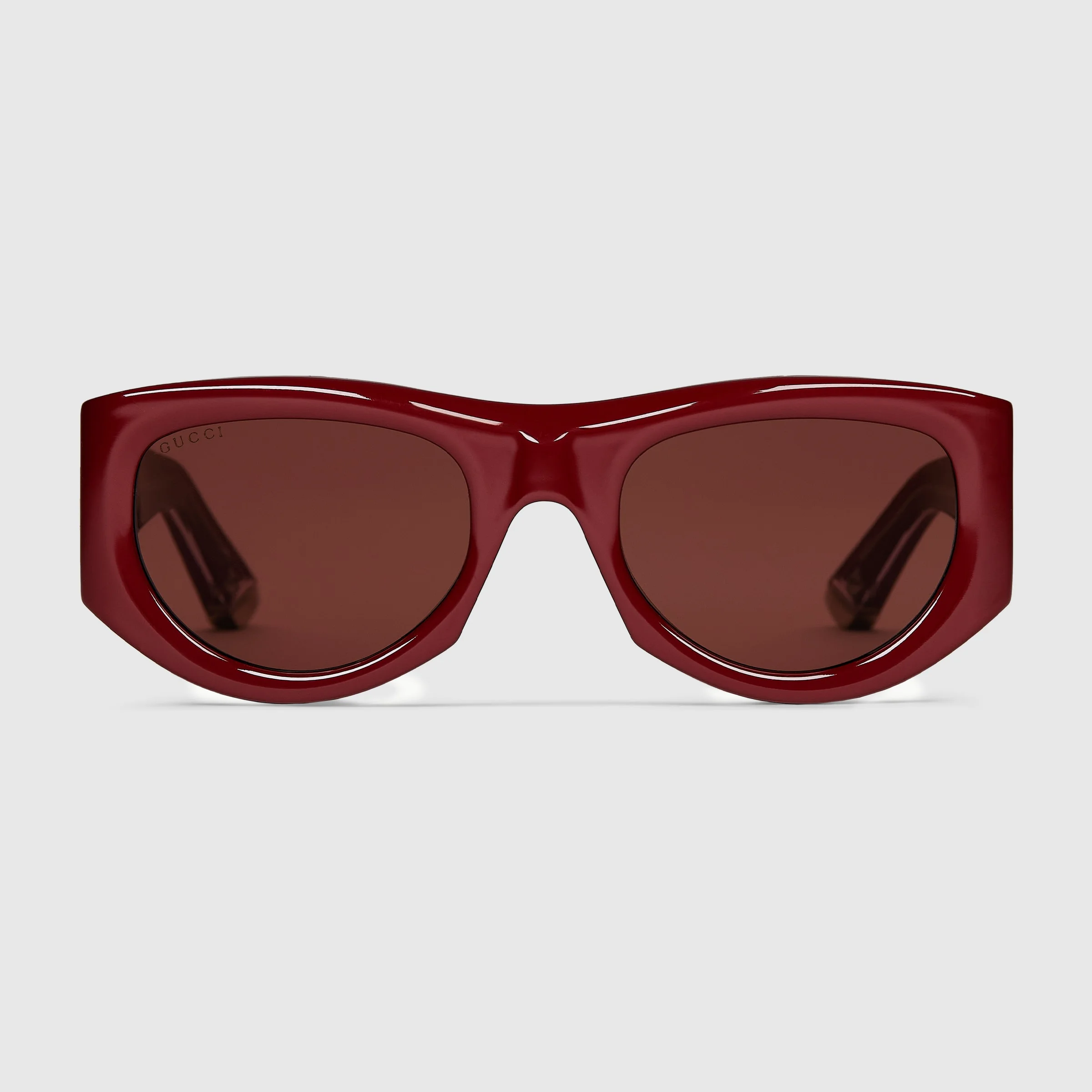 These stylish rectangular-frame sunglasses are distinguished by their glossy burgundy acetate construction, featuring the iconic Gucci logo elegantly displayed on the temples. Complemented by solid brown lenses, they offer a perfect fusion of contemporary design and classic luxury. - Shiny burgundy acetate frame - Shiny burgundy acetate temples with Gucci logo - Solid brown lens - 100% UVA/UVB protection - GG1917S - Temple length: 5.51"; Lens height: 1.57"; Nose bridge length: 0.83" - Frame height: 1.9"; Frame width: 5.7" - Made in Italy - The Rosso Ancora packaging, a distinctive color chosen by Creative Director Sabato De Sarno to mark the beginning of Gucci's new creative chapter, includes a vinyl case and satin pouch.