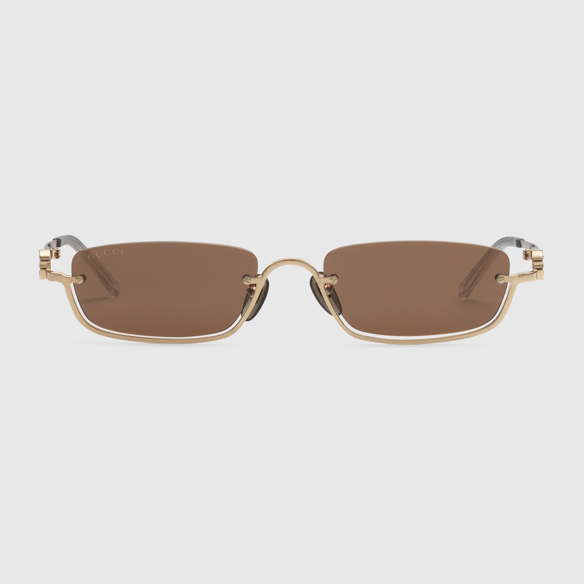 A pair of rectangular-frame sunglasses crafted in gold-toned metal frame and solid brown lenses. The distinctive Interlocking G detail continues to be a distinguishing feature of Gucci's collections and appears along the temples. - Shiny gold-toned metal frame - Shiny gold-toned metal temples with cut-out Interlocking G and acetate tips - Solid brown lens - 100% UVA/UVB protection - Frame height: 1.1"; Frame Width: 5.7" - GG1278S - Temple length: 5.5"; Lens height: 1.1", Nose bridge length: .7" - The glasses will arrive in a velvet case, available in a range of six jewel-toned colors and paired with a coordinating satin lining. The case color will be individually selected for each pair of glasses and comes with a matching satin flannel pouch and ivory microfiber cloth.