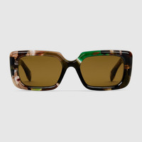 The Cruise 2025 eyewear collection crafts a rectangular silhouette with ReAce acetate for a contemporary design. These sunglasses feature a Gucci logo on the temples. - Shiny green and brown tortoiseshell acetate frame, made of ReAce, a 100% recycled acetate derived from pre consumer acetate scraps - Shiny green and brown tortoiseshell acetate temples with Gucci logo - Solid khaki lens - 100% UVA/UVB protection - GG1906S - Temple length: 5.7"; Lens height: 1.5"; Nose bridge length: 0.7" - Frame height: 1.9"; Frame width: 5.7"; Hinge to hinge: 5" - Made in Italy - The eyewear case in the House’s signature Gucci Rosso Ancora red hue is complete with a magnetic closure and white interior.