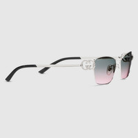 The House's eyewear collection continues to reinterpret emblematic motifs, from the GG, Web, bamboo, Horsebit and equestrian inspirations, in sumptuous materials, intricate craftsmanship, and fresh hues. Set in a gold-toned metal frame, these rectangular frame sunglasses reveal a crystal Interlocking G detail across the temples. - Shiny silver-toned metal frame - Shiny silver-toned metal temples with crystal Interlocking G and black acetate endtips - Gradient grey and pink lens - 100% UVA/UVB protection - Adjustable nose pads - GG2045S - Temple length: 5.3"; Lens height: 1.4"; Nose bridge length: 0.6" - Frame height: 5.4"; Frame width: 1.5"; Hinge to hinge: 5.1" - The eyewear case in the House’s signature Rosso Ancora red hue is complete with a magnetic closure and white interior